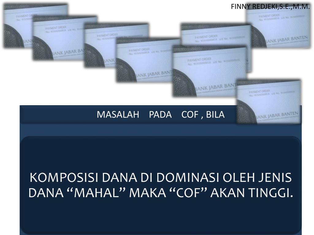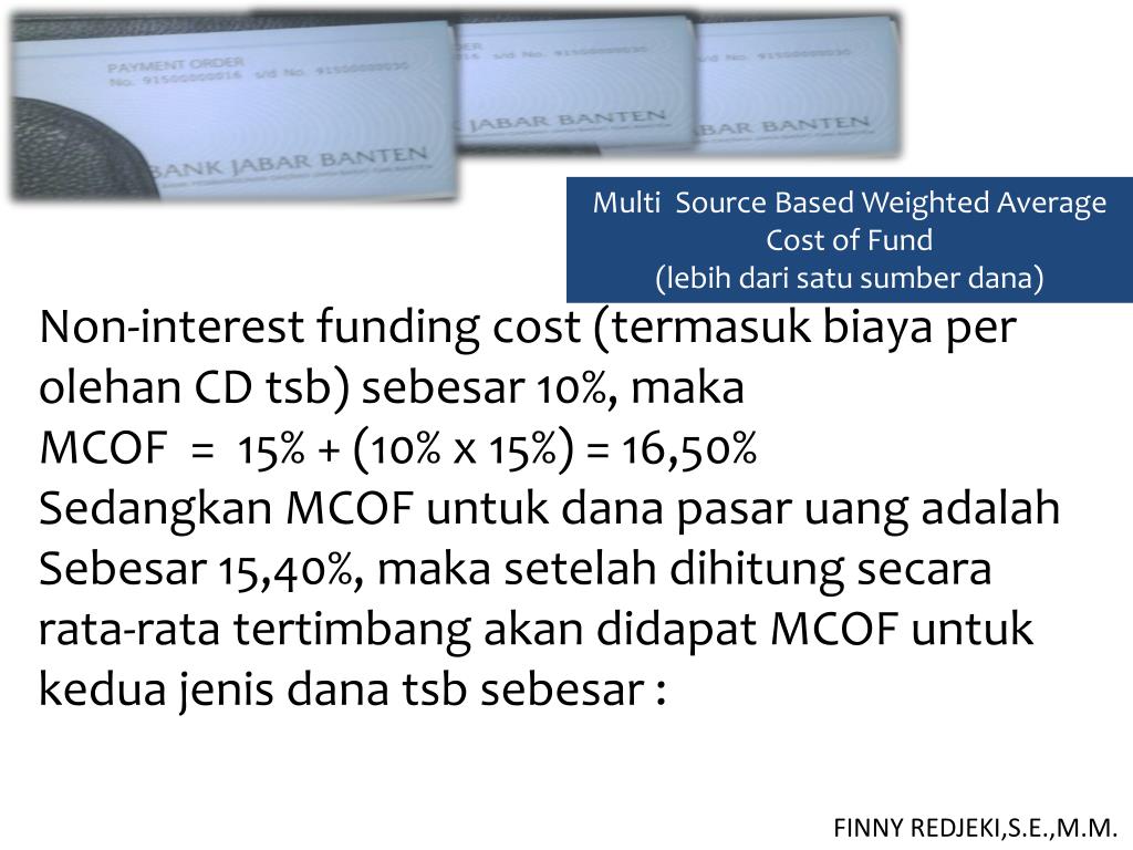 Multi Source Based Weighted Average Cost of Fund (lebih dari satu sumber dana) Non-interest funding cost (termasuk biaya per olehan CD tsb) sebesar 10%, maka MCOF = 15% + (10% x 15%) = 16,50% Sedangkan MCOF untuk dana pasar uang adalah Sebesar 15,40%, maka setelah dihitung secara rata-rata tertimbang akan didapat MCOF untuk kedua jenis dana tsb sebesar : FINNY REDJEKI,S.E.,M.M.
