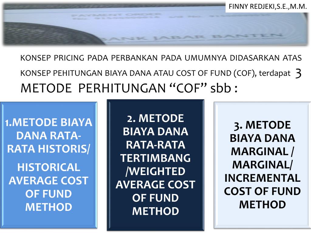 FINNY REDJEKI,S.E.,M.M. KONSEP PRICING PADA PERBANKAN PADA UMUMNYA DIDASARKAN ATAS KONSEP PEHITUNGAN BIAYA DANA ATAU COST OF FUND (COF), terdapat 3 METODE PERHITUNGAN “COF” sbb :