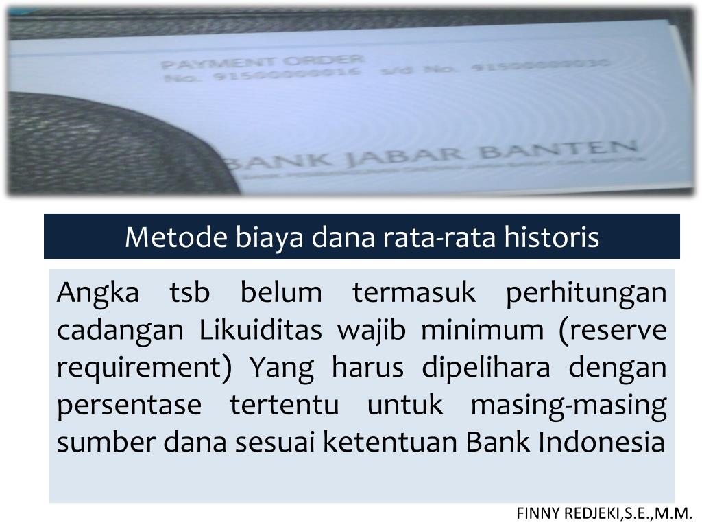 Metode biaya dana rata-rata historis Angka tsb belum termasuk perhitungan cadangan Likuiditas wajib minimum (reserve requirement) Yang harus dipelihara dengan persentase tertentu untuk masing-masing sumber dana sesuai ketentuan Bank Indonesia FINNY REDJEKI,S.E.,M.M.