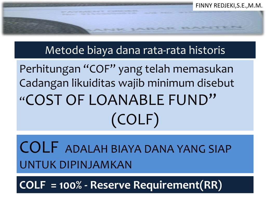 FINNY REDJEKI,S.E.,M.M. Metode biaya dana rata-rata historis Perhitungan “COF” yang telah memasukan Cadangan likuiditas wajib minimum disebut “COST OF LOANABLE FUND” (COLF) COLF ADALAH BIAYA DANA YANG SIAP UNTUK DIPINJAMKAN COLF = 100% - Reserve Requirement(RR)