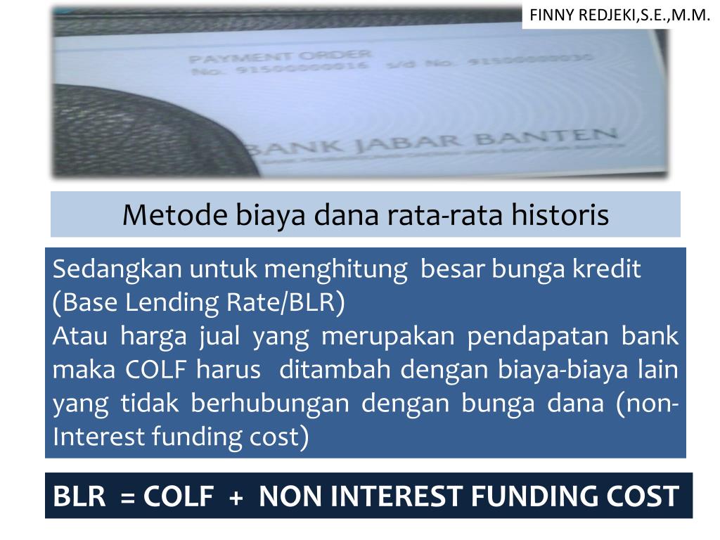 FINNY REDJEKI,S.E.,M.M. Metode biaya dana rata-rata tertimbang BLR = COLF + PM + T + CP + OC + SC BLR = Base Lending Rate, ATAU ROL = Rate Of Loan = BLR COLF = Cost Of Loanable Fund PM = Profit Margin T = Tax (Pajak atas Profit Margin) CP = Credit Premium untuk menutup cadangan aktiva yang diklasifikasikan/ risiko kredit bermasalah. OC = Overhead Cost SC = Service Cost (Termasuk Biaya Tenaga Kerja)