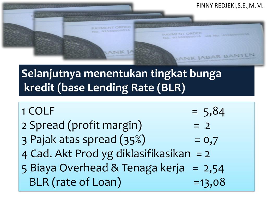 FINNY REDJEKI,S.E.,M.M. Selanjutnya menentukan tingkat bunga kredit (base Lending Rate (BLR) 1 COLF = 5,84 2 Spread (profit margin) = 2 3 Pajak atas spread (35%) = 0,7 4 Cad. Akt Prod yg diklasifikasikan = 2 5 Biaya Overhead & Tenaga kerja = 2,54 BLR (rate of Loan) =13,08