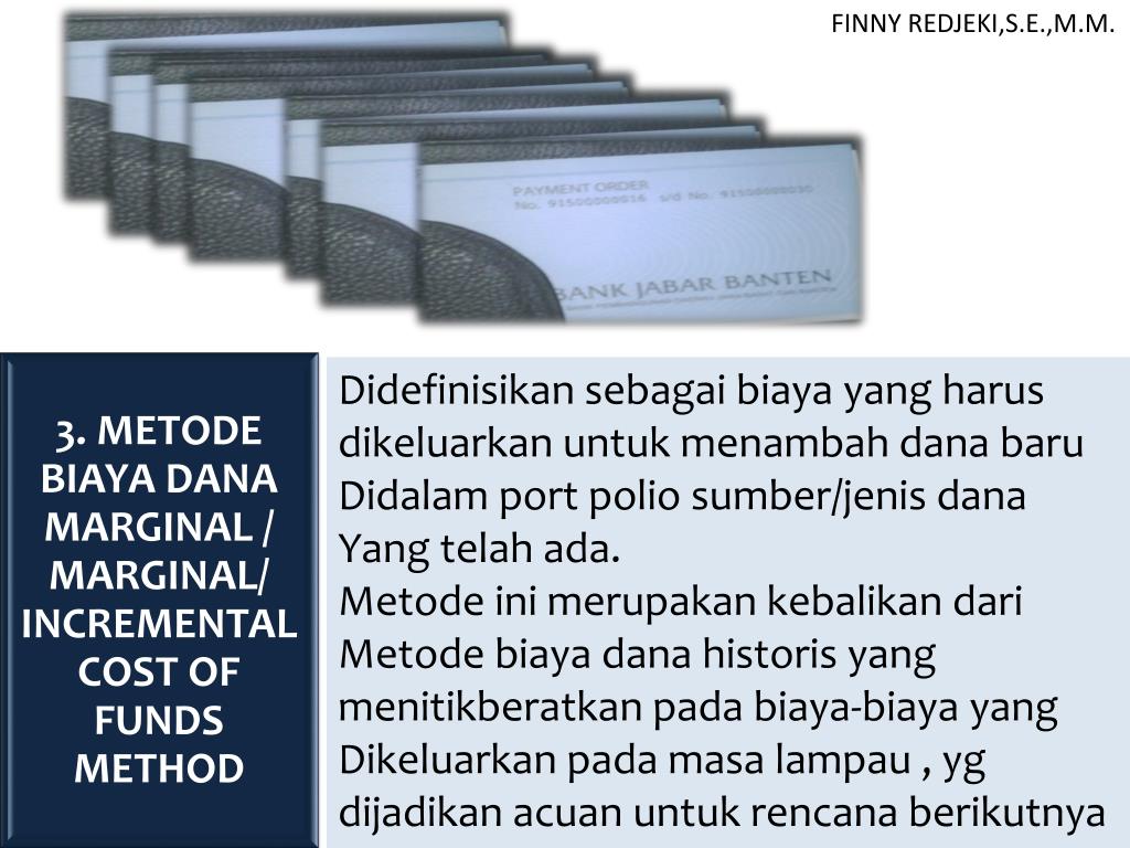 6.1.Perhitungan Biaya Dana (Cost of Fund/ COF) dan Cost Of Loanable Fund (COFL) 6.2. Bunga Kredit (Based Lending Rate) Bank Umum Konvensional.6.1.1. Metode Biaya Dana Rata-rata Historis 6.1.2. Metode Biaya Dana Rata-rata Tertimbang 6.1.3. Metode Biaya Marginal/ Incremental (Marginal/Incremantal cost of fund methods) FINNY REDJEKI,S.E.,M.M.