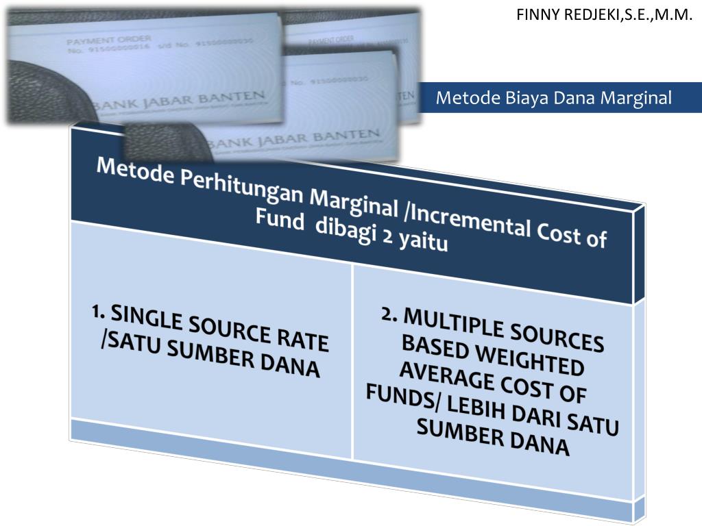 FINNY REDJEKI,S.E.,M.M. Didefinisikan sebagai biaya yang harus dikeluarkan untuk menambah dana baru Didalam port polio sumber/jenis dana Yang telah ada. Metode ini merupakan kebalikan dari Metode biaya dana historis yang menitikberatkan pada biaya-biaya yang Dikeluarkan pada masa lampau , yg dijadikan acuan untuk rencana berikutnya