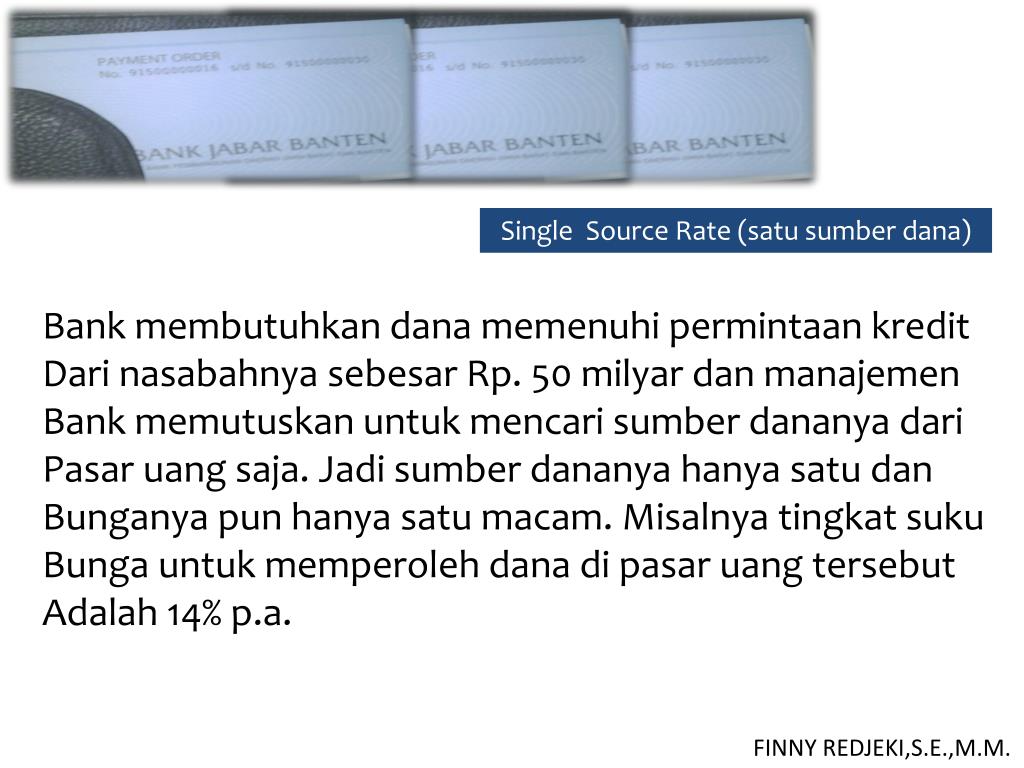 Single Source Rate (satu sumber dana) Bank membutuhkan dana memenuhi permintaan kredit Dari nasabahnya sebesar Rp. 50 milyar dan manajemen Bank memutuskan untuk mencari sumber dananya dari Pasar uang saja. Jadi sumber dananya hanya satu dan Bunganya pun hanya satu macam. Misalnya tingkat suku Bunga untuk memperoleh dana di pasar uang tersebut Adalah 14% p.a. FINNY REDJEKI,S.E.,M.M.