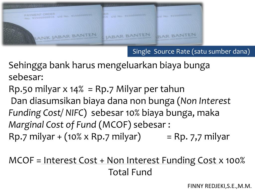 Single Source Rate (satu sumber dana) Sehingga bank harus mengeluarkan biaya bunga sebesar: Rp.50 milyar x 14% = Rp.7 Milyar per tahun Dan diasumsikan biaya dana non bunga (Non Interest Funding Cost/ NIFC) sebesar 10% biaya bunga, maka Marginal Cost of Fund (MCOF) sebesar : Rp.7 milyar + (10% x Rp.7 milyar) = Rp. 7,7 milyar MCOF = Interest Cost + Non Interest Funding Cost x 100% Total Fund FINNY REDJEKI,S.E.,M.M.