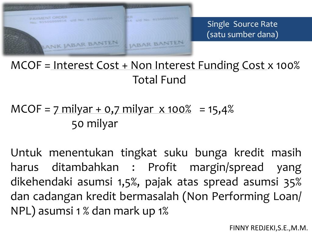 Single Source Rate (satu sumber dana) MCOF = Interest Cost + Non Interest Funding Cost x 100% Total Fund MCOF = 7 milyar + 0,7 milyar x 100% = 15,4% 50 milyar Untuk menentukan tingkat suku bunga kredit masih harus ditambahkan : Profit margin/spread yang dikehendaki asumsi 1,5%, pajak atas spread asumsi 35% dan cadangan kredit bermasalah (Non Performing Loan/ NPL) asumsi 1 % dan mark up 1% FINNY REDJEKI,S.E.,M.M.