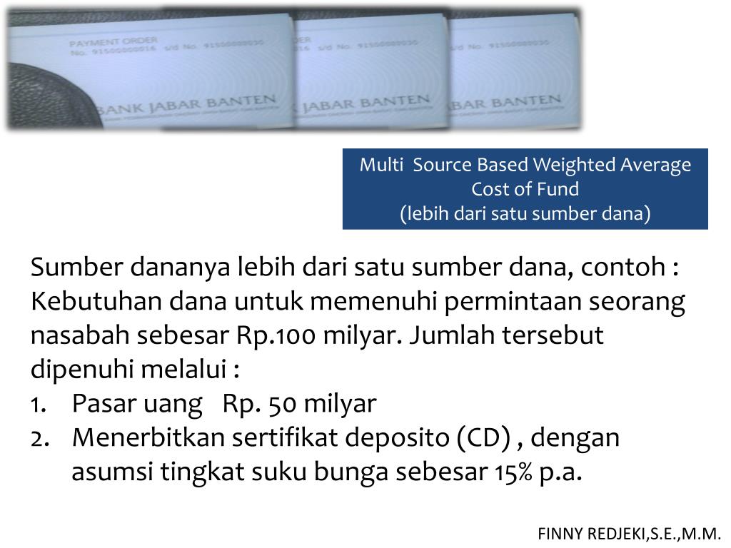 Multi Source Based Weighted Average Cost of Fund (lebih dari satu sumber dana) Sumber dananya lebih dari satu sumber dana, contoh : Kebutuhan dana untuk memenuhi permintaan seorang nasabah sebesar Rp.100 milyar. Jumlah tersebut dipenuhi melalui : Pasar uang Rp. 50 milyar Menerbitkan sertifikat deposito (CD) , dengan asumsi tingkat suku bunga sebesar 15% p.a. FINNY REDJEKI,S.E.,M.M.