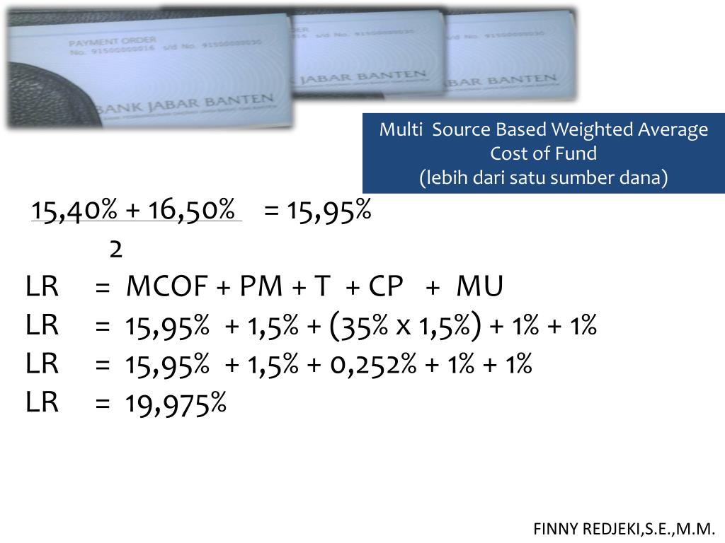 Multi Source Based Weighted Average Cost of Fund (lebih dari satu sumber dana) 15,40% + 16,50% = 15,95% 2 LR = MCOF + PM + T + CP + MU LR = 15,95% + 1,5% + (35% x 1,5%) + 1% + 1% LR = 15,95% + 1,5% + 0,252% + 1% + 1% LR = 19,975% FINNY REDJEKI,S.E.,M.M.
