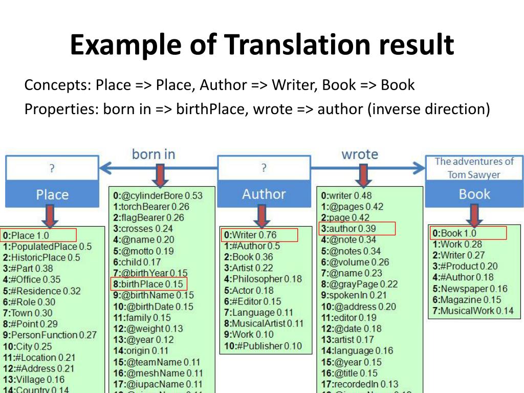 Example of Translation result Concepts: Place => Place, Author => Writer, Book => Book Properties: born in => birthPlace, wrote => author (inverse direction)