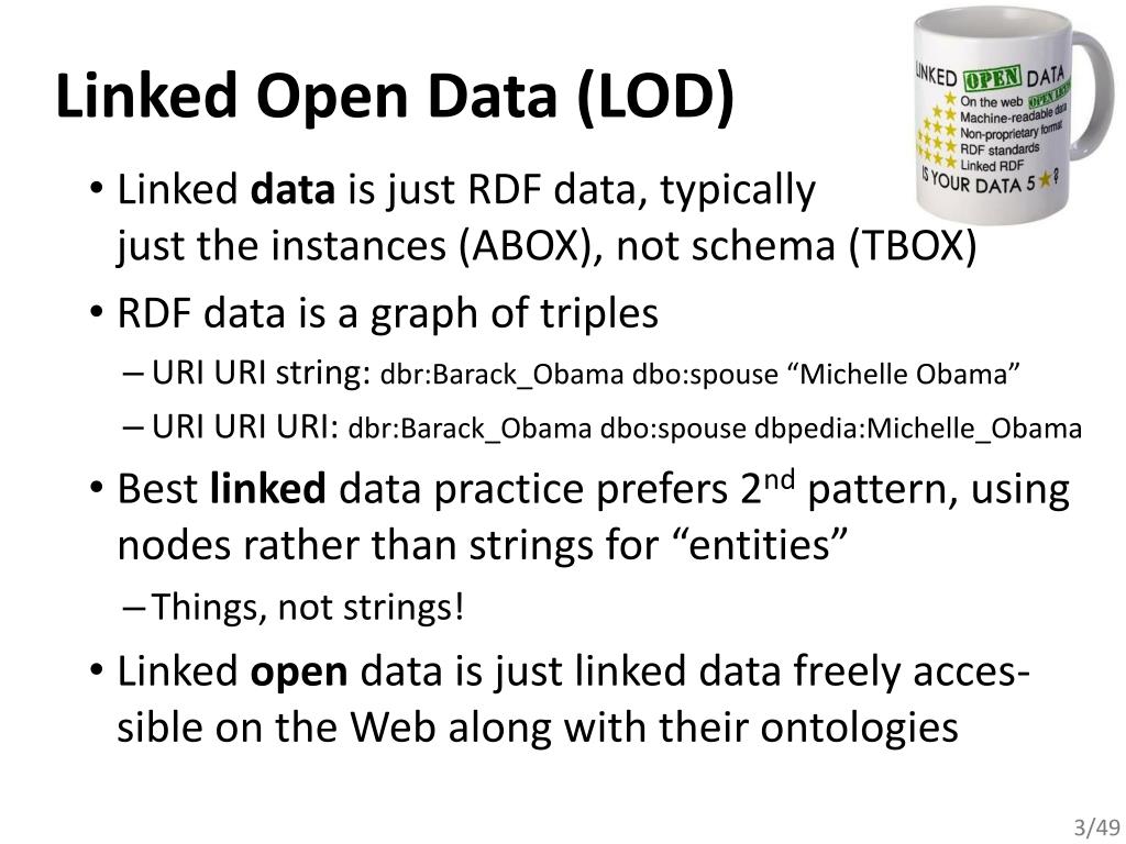 Linked Open Data (LOD) • Linked data is just RDF data, typicallyjust the instances (ABOX), not schema (TBOX) • RDF data is a graph of triples • URI URI string: dbr:Barack_Obamadbo:spouse “Michelle Obama” • URI URI URI:dbr:Barack_Obamadbo:spousedbpedia:Michelle_Obama • Best linked data practice prefers 2nd pattern, using nodes rather than strings for “entities” • Things, not strings! • Linked open data is just linked data freely acces-sibleon the Web along with theirontologies