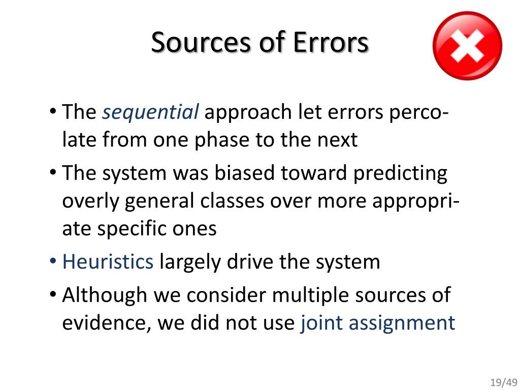 Sources of Errors The sequential approach let errors perco-late from one phase to the next The system was biased toward predicting overly general classes over more appropri-ate specific ones Heuristics largely drive the system Although we consider multiple sources of evidence, we did not use joint assignment