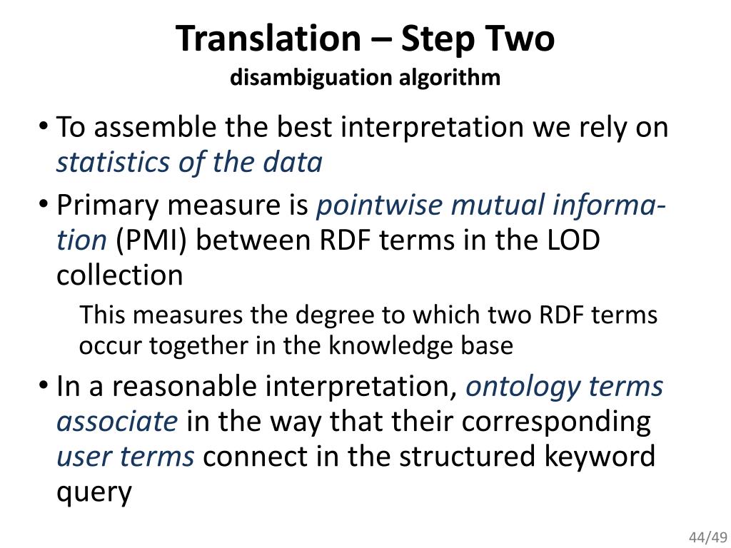 Translation – Step Twodisambiguation algorithm • To assemble the best interpretation we rely on statistics of the data • Primary measure is pointwise mutual informa-tion (PMI) between RDF terms in the LOD collection This measures the degree to which two RDF termsoccur together in the knowledge base • In a reasonable interpretation, ontology terms associate in the way that their corresponding user terms connect in the structured keyword query