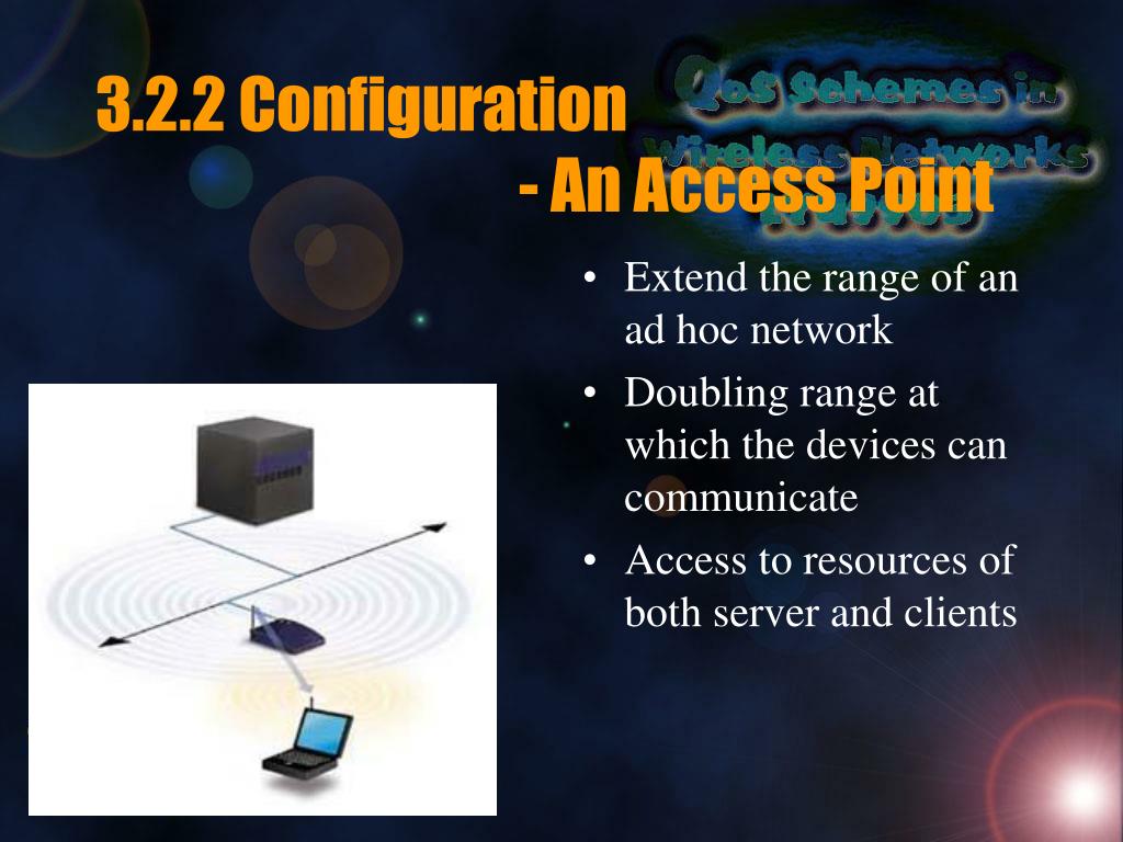 3.2.2 Configuration - An Access Point • Extend the range of an ad hoc network • Doubling range at which the devices can communicate • Access to resources of both server and clients