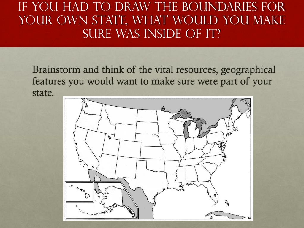 If you had to draw the boundaries for your own state, what would you make sure was inside of it? Brainstorm and think of the vital resources, geographical features you would want to make sure were part of your state.