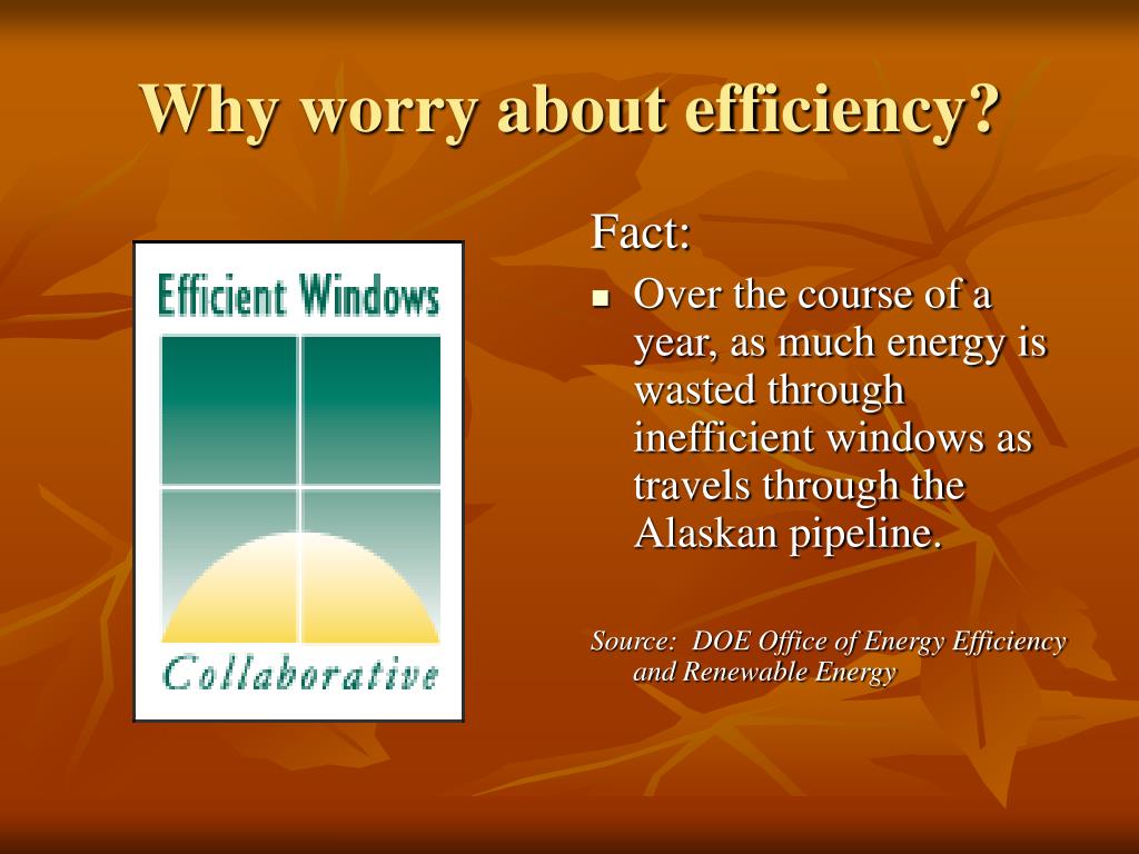 Why worry about efficiency? Fact: • Over the course of a year, as much energy is wasted through inefficient windows as travels through the Alaskan pipeline. Source: DOE Office of Energy Efficiency and Renewable Energy