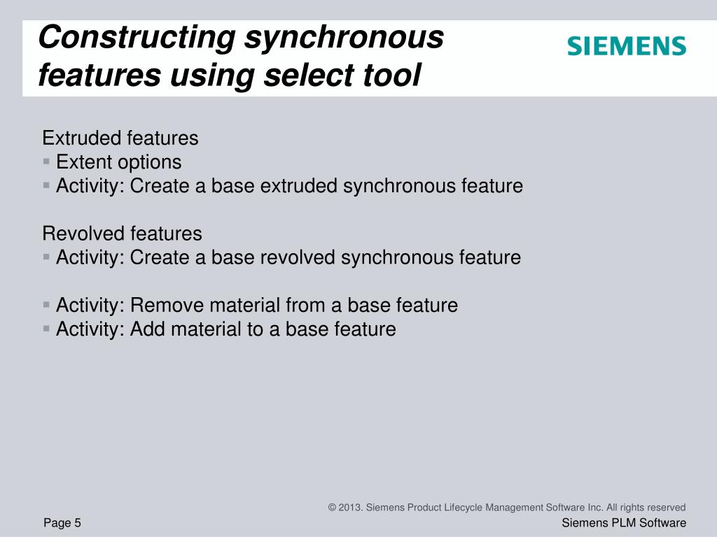 Constructing synchronous features using select tool • Extruded features • Extent options • Activity: Create a base extruded synchronous feature • Revolved features • Activity: Create a base revolved synchronous feature • Activity: Remove material from a base feature • Activity: Add material to a base feature