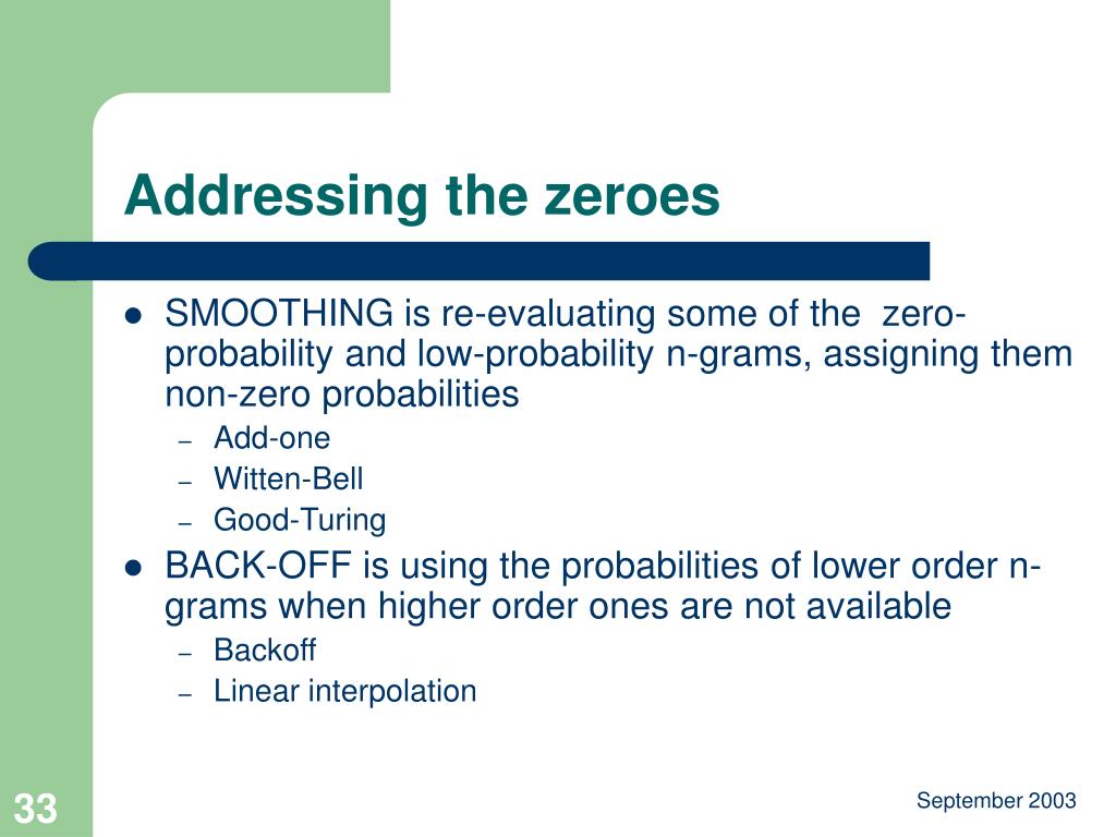 Addressing the zeroes • SMOOTHING is re-evaluating some of the zero-probability and low-probability n-grams, assigning them non-zero probabilities • Add-one • Witten-Bell • Good-Turing • BACK-OFF is using the probabilities of lower order n-grams when higher order ones are not available • Backoff • Linear interpolation