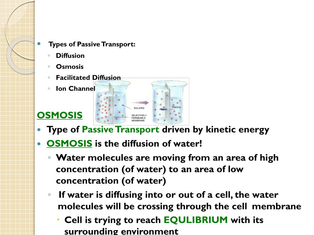 Types of Passive Transport: • Diffusion • Osmosis • Facilitated Diffusion • Ion Channel OSMOSIS • Type of Passive Transport driven by kinetic energy • OSMOSISis the diffusion of water! • Water molecules are moving from an area of high concentration (of water) to an area of low concentration (of water) • If water is diffusing into or out of a cell, the water molecules will be crossing through the cell membrane • Cell is trying to reach EQULIBRIUM with its surrounding environment