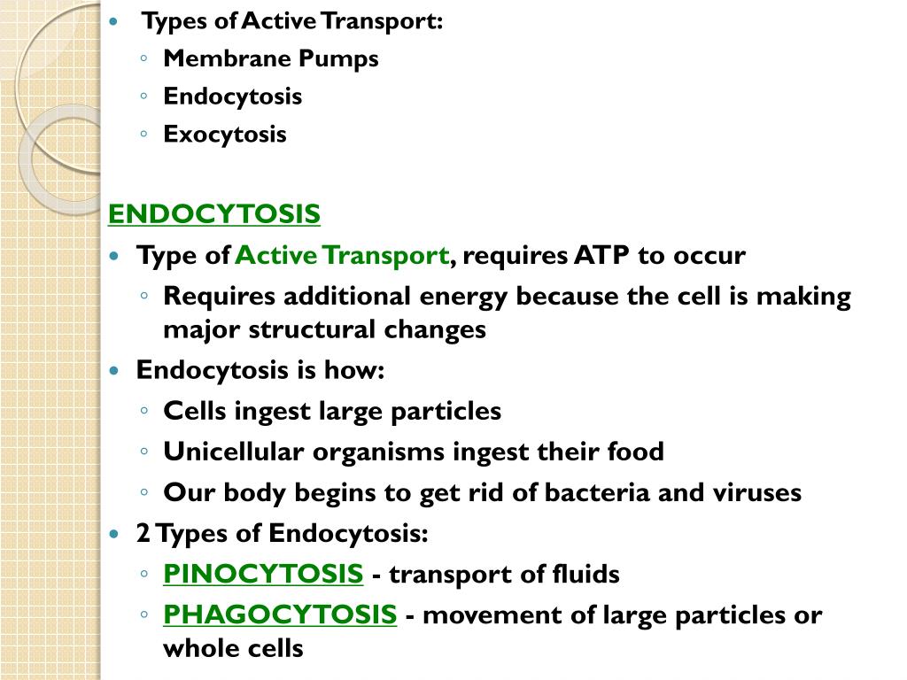 Types of Active Transport: • Membrane Pumps • Endocytosis • Exocytosis ENDOCYTOSIS • Type of Active Transport, requires ATP to occur • Requires additional energy because the cell is making major structural changes • Endocytosis is how: • Cells ingest large particles • Unicellular organisms ingest their food • Our body begins to get rid of bacteria and viruses • 2 Types of Endocytosis: • PINOCYTOSIS- transport of fluids • PHAGOCYTOSIS- movement of large particles or whole cells