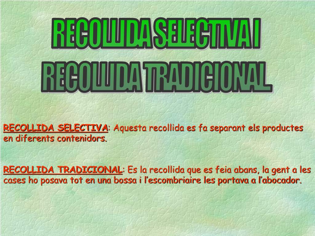 RECOLLIDA SELECTIVA I RECOLLIDA TRADICIONAL. RECOLLIDA SELECTIVA: Aquesta recollida es fa separant els productes en diferents contenidors. RECOLLIDA TRADICIONAL: Es la recollida que es feia abans, la gent a les cases ho posava tot en una bossa i l’escombriaire les portava a l’abocador.