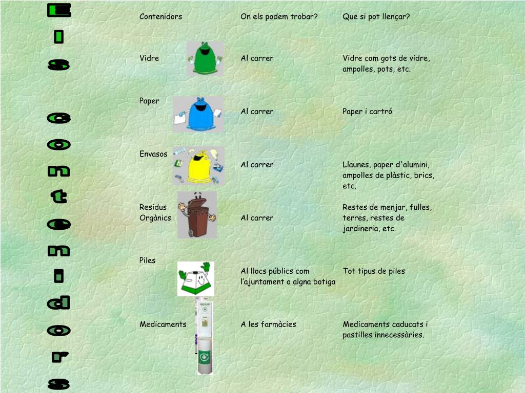 REDUIR: No consumir tant els productes. REUTILITZAR: Tornar a utilitzar els productes que ja s’han fet servir. RECICLAR:Llençar les deixalles al contenidor que els hi pertany.