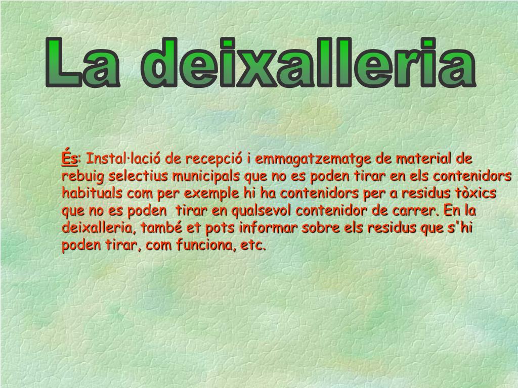 La deixalleria És: Instal·lació de recepció i emmagatzematge de material de rebuig selectius municipals que no es poden tirar en els contenidors habituals com per exemple hi ha contenidors per a residus tòxics que no es poden tirar en qualsevol contenidor de carrer. En la deixalleria, també et pots informar sobre els residus que s'hi poden tirar, com funciona, etc.