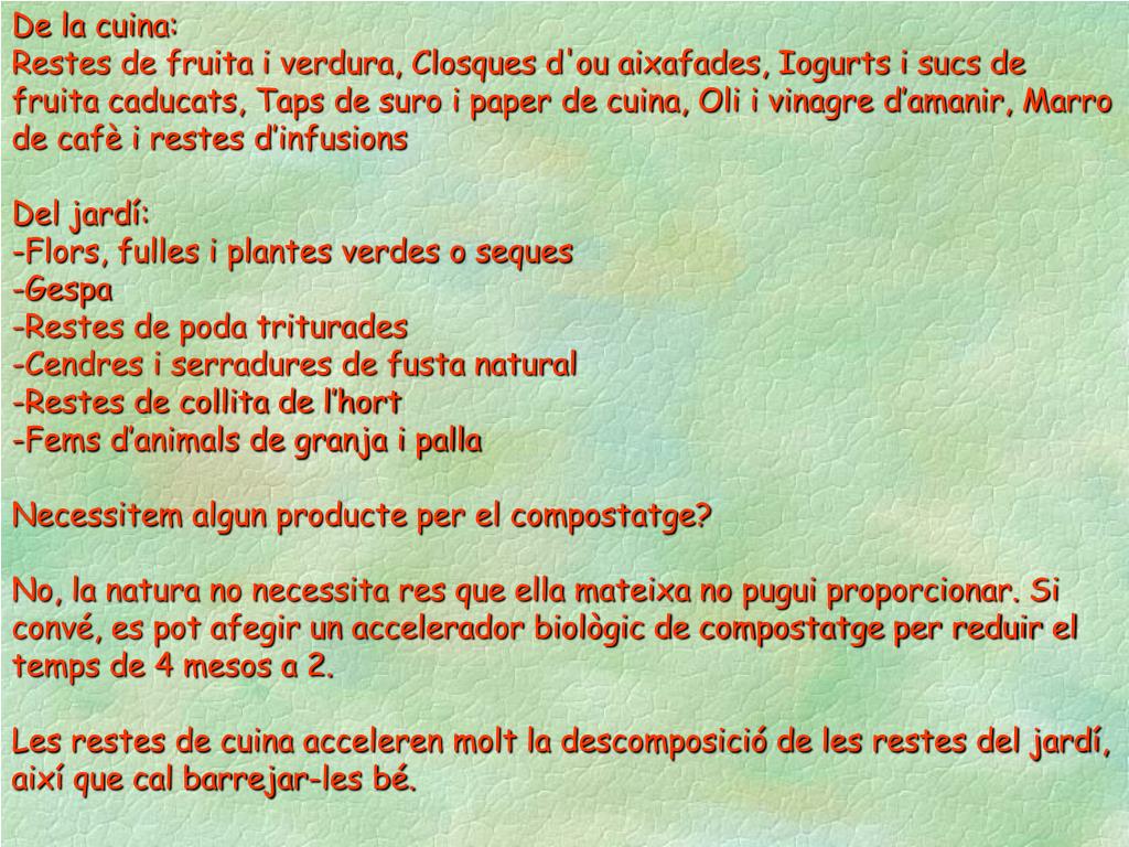 De la cuina:Restes de fruita i verdura, Closques d'ou aixafades, Iogurts i sucs de fruita caducats, Taps de suro i paper de cuina, Oli i vinagre d’amanir, Marro de cafè i restes d’infusionsDel jardí:-Flors, fulles i plantes verdes o seques-Gespa-Restes de poda triturades-Cendres i serradures de fusta natural-Restes de collita de l’hort-Fems d’animals de granja i palla Necessitem algun producte per el compostatge? No, la natura no necessita res que ella mateixa no pugui proporcionar. Si convé, es pot afegir un accelerador biològic de compostatge per reduir el temps de 4 mesos a 2.Les restes de cuina acceleren molt la descomposició de les restes del jardí, així que cal barrejar-les bé.