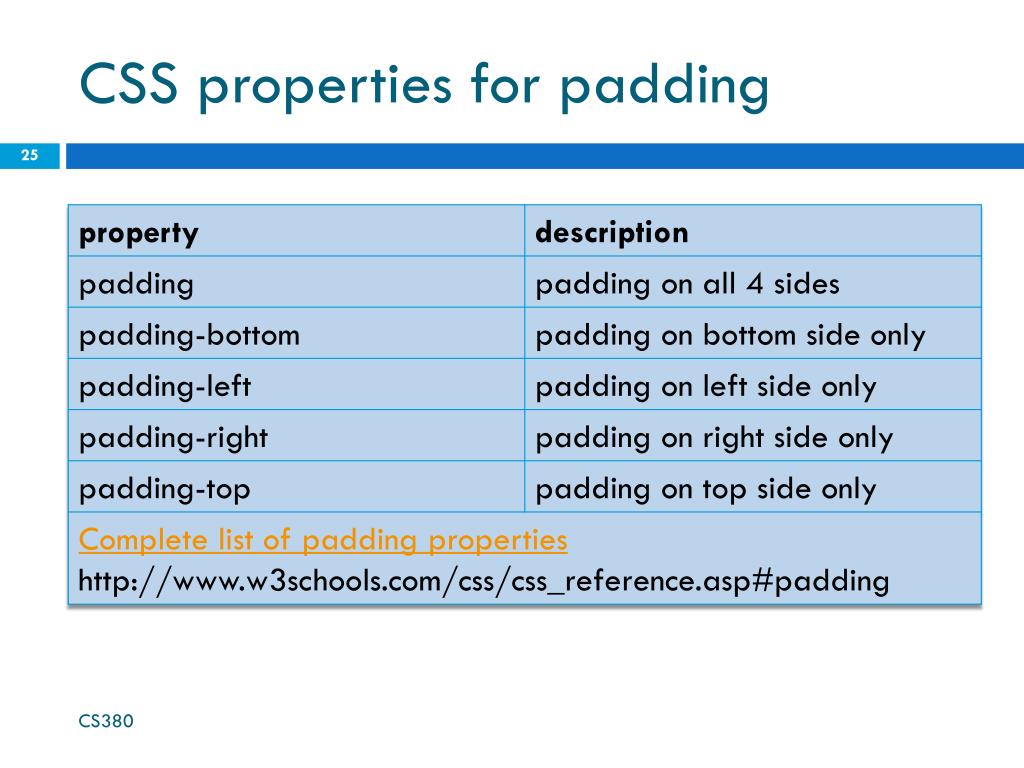 Padding example 1 p { padding: 20px; border: 3px solid black; } h2 { padding: 0px; background-color: yellow; } CSS This is a first paragraph. This is a second paragraph. output This is a heading CS380