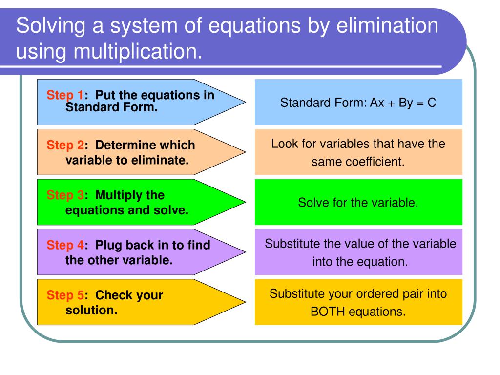 Solving a system of equations by elimination using multiplication. Standard Form: Ax + By = C Step 1: Put the equations in Standard Form. Step 2: Determine which variable to eliminate. Look for variables that have the same coefficient. Step 3: Multiply the equations and solve. Solve for the variable. Step 4: Plug back in to find the other variable. Substitute the value of the variable into the equation. Step 5: Check your solution. Substitute your ordered pair into BOTH equations.