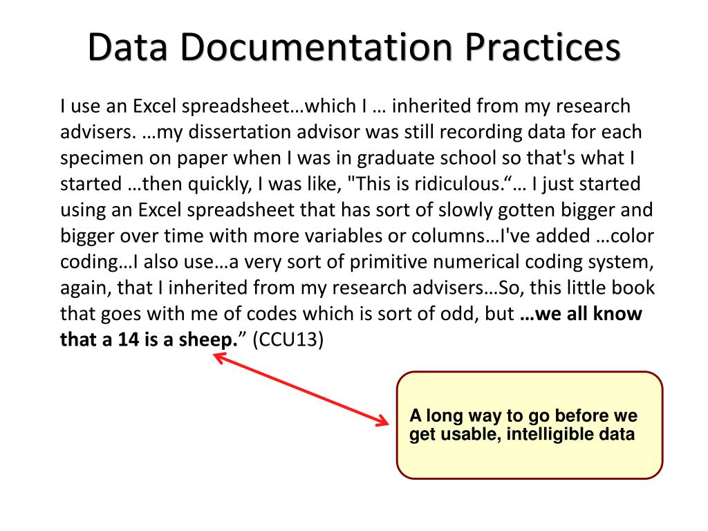 Data Documentation Practices I use an Excel spreadsheet…which I … inherited from my research advisers. …my dissertation advisor was still recording data for each specimen on paper when I was in graduate school so that's what I started …then quickly, I was like, "This is ridiculous.“… I just started using an Excel spreadsheet that has sort of slowly gotten bigger and bigger over time with more variables or columns…I've added …color coding…I also use…a very sort of primitive numerical coding system, again, that I inherited from my research advisers…So, this little book that goes with me of codes which is sort of odd, but …we all know that a 14 is a sheep.” (CCU13) A long way to go before we get usable, intelligible data
