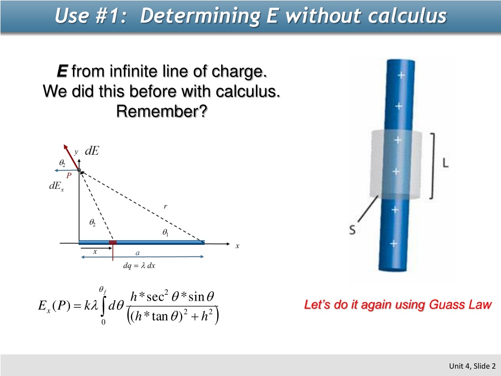 Use #1: Determining E without calculus E from infinite line of charge. We did this before with calculus. Remember? Let’s do it again using Guass Law