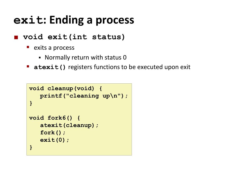exit: Ending a process • void exit(int status) • exits a process • Normally return with status 0 • atexit()registers functions to be executed upon exit void cleanup(void) { printf("cleaning up\n"); } void fork6() { atexit(cleanup); fork(); exit(0); }