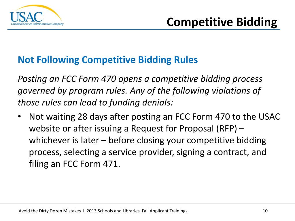 Posting an FCC Form 470 opens a competitive bidding process governed by program rules. Any of the following violations of those rules can lead to funding denials: • Not waiting 28 days after posting an FCC Form 470 to the USAC website or after issuing a Request for Proposal (RFP) – whichever is later – before closing your competitive bidding process, selecting a service provider, signing a contract, and filing an FCC Form 471. • Not Following Competitive Bidding Rules • Competitive Bidding