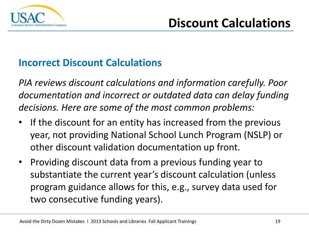 PIA reviews discount calculations and information carefully. Poor documentation and incorrect or outdated data can delay funding decisions. Here are some of the most common problems: • If the discount for an entity has increased from the previous year, not providing National School Lunch Program (NSLP) or other discount validation documentation up front. • Providing discount data from a previous funding year to substantiate the current year’s discount calculation (unless program guidance allows for this, e.g., survey data used for two consecutive funding years). • Incorrect Discount Calculations • Discount Calculations