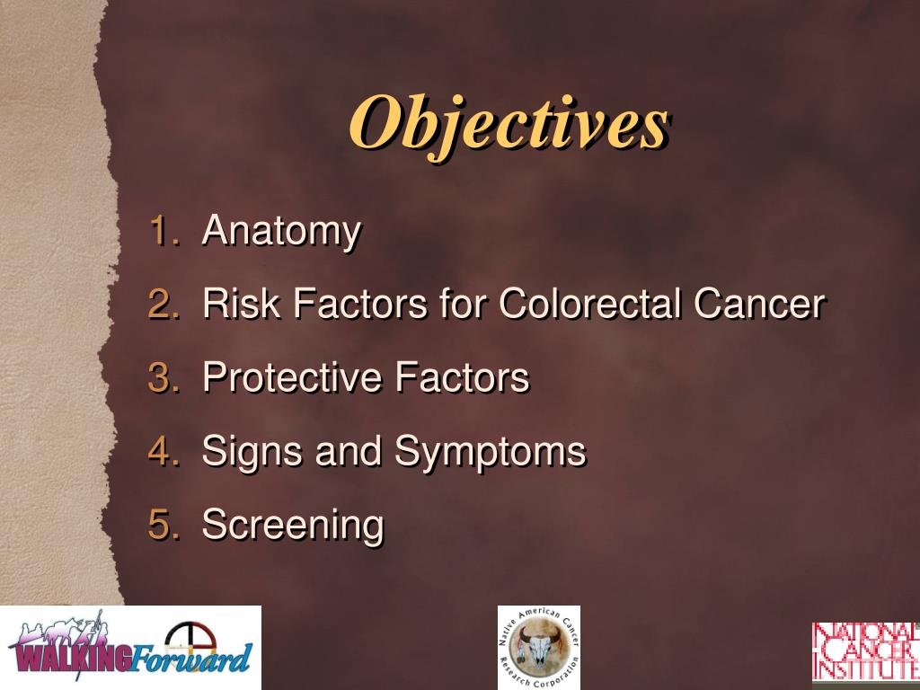 Objectives Anatomy Risk Factors for Colorectal Cancer Protective Factors Signs and Symptoms Screening