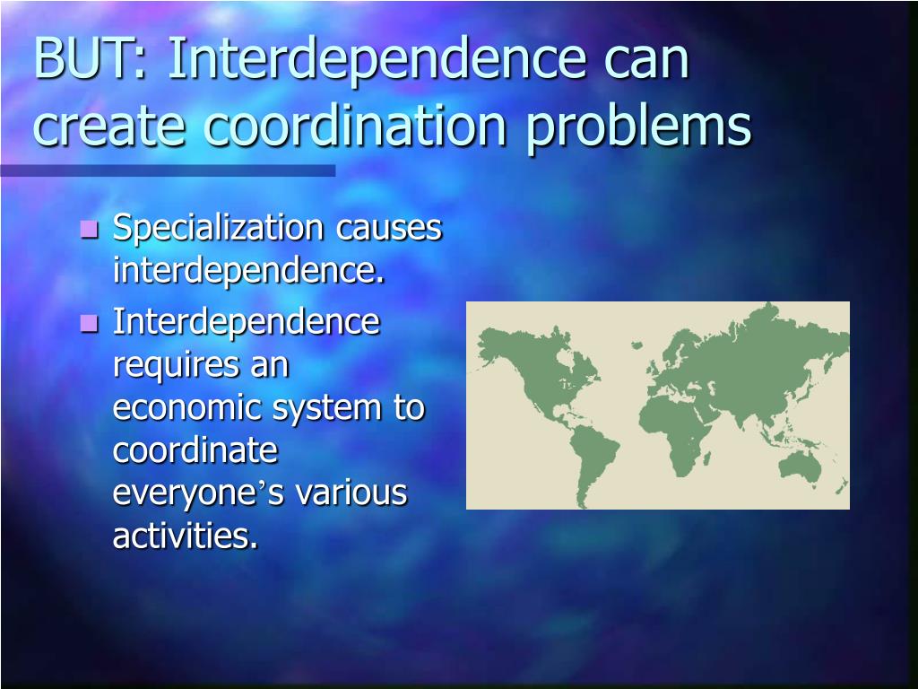BUT: Interdependence can create coordination problems • Specialization causes interdependence. • Interdependence requires an economic system to coordinate everyone’s various activities.