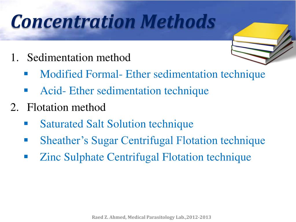 Concentration Methods • Sedimentation method • Modified Formal- Ether sedimentation technique • Acid- Ether sedimentation technique • Flotation method • Saturated Salt Solution technique • Sheather’s Sugar Centrifugal Flotation technique • Zinc Sulphate Centrifugal Flotation technique Raed Z. Ahmed, Medical Parasitology Lab.,2012-2013