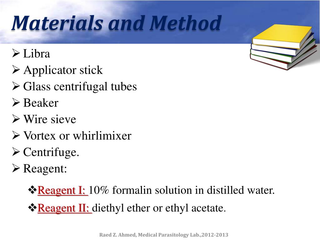 Materials and Method • Libra • Applicator stick • Glass centrifugal tubes • Beaker • Wire sieve • Vortex or whirlimixer • Centrifuge. • Reagent: • Reagent I: 10% formalin solution in distilled water. • Reagent II: diethyl ether or ethyl acetate. Raed Z. Ahmed, Medical Parasitology Lab.,2012-2013