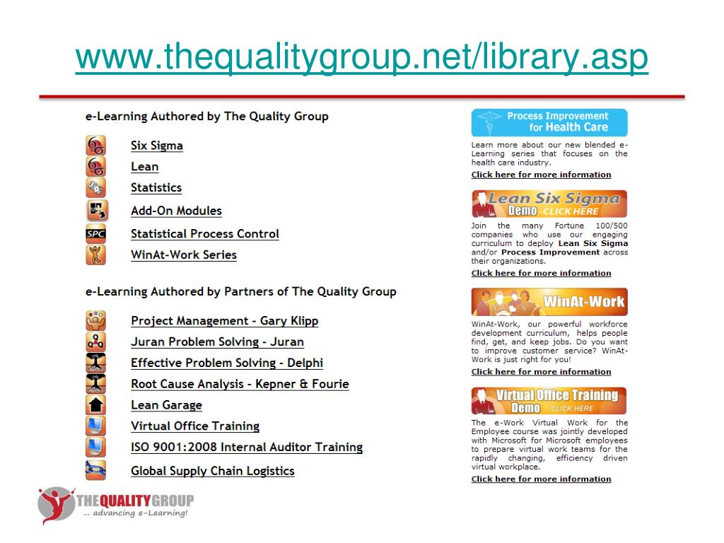 The Quality Group The Quality Group (TQG) is an Atlanta-based leader in blended e-Learning systems with a special focus on Lean Six Sigma. The Quality Group has been providing customized, best-of-class blended e-Learning solutions for leading global corporations and academic institutions since 1992. Our solutions include rich and engaging content ranging from Lean, Six Sigma, SPC and Basic Statistics to Project Management, ISO Internal Auditor, Employability Soft Skills (the WinAt-Work® series) and Logistics. TQG has partnered with some of the top Colleges and Universities in the country. Since 2004, these colleges and universities have trained more than 5,000 individuals and trained workers at dozens of companies using TQG’s Lean Six Sigma blended e-Learning program. 2