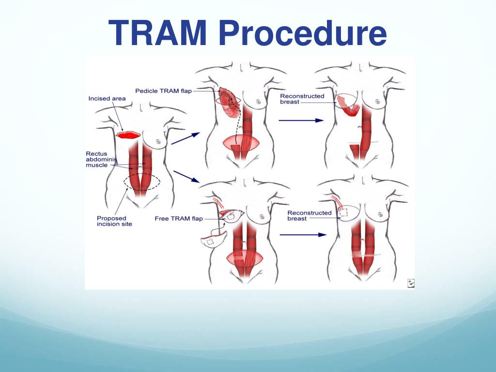 TRAM Procedure • TRAM procedures may consist of either pedicled flaps or free flaps. • In pedicled TRAM procedures, the rectus abdominis remains tethered to the abdominal wall and is tunneled under the skin to reconstruct the breast. • The free TRAM flap consists of muscle, fat, skin, and vessels from the lower abdomen that is then transplanted to the recipient site on the chest wall.