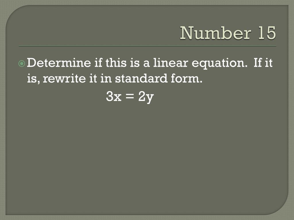 Number 15 • Determine if this is a linear equation. If it is, rewrite it in standard form. 3x = 2y