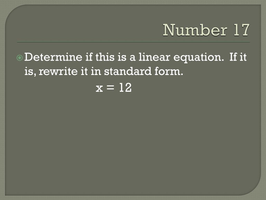 Number 17 • Determine if this is a linear equation. If it is, rewrite it in standard form. x = 12