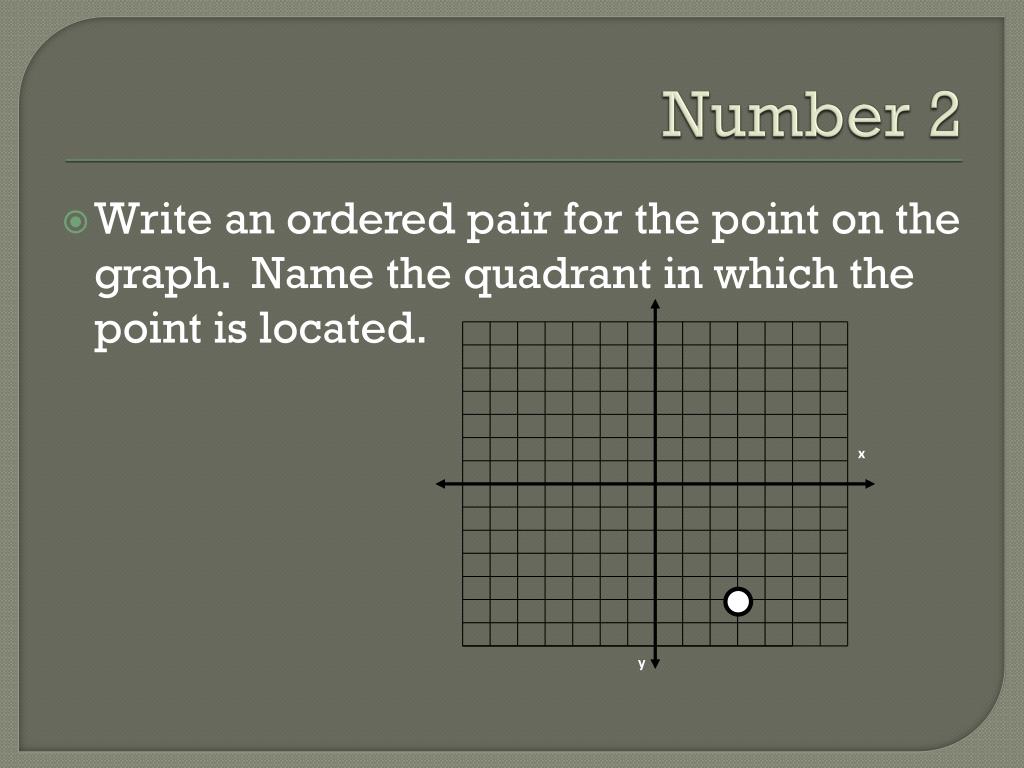 x y Number 2 Write an ordered pair for the point on the graph. Name the quadrant in which the point is located.