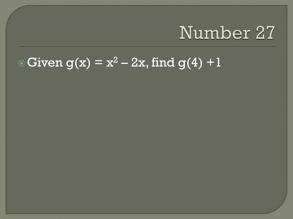 Number 27 Given g(x) = x2 – 2x, find g(4) +1