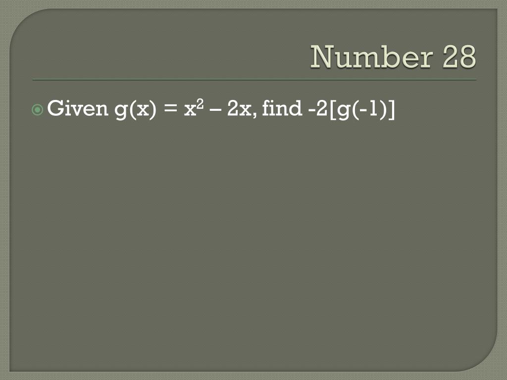 Number 28 Given g(x) = x2 – 2x, find -2[g(-1)]
