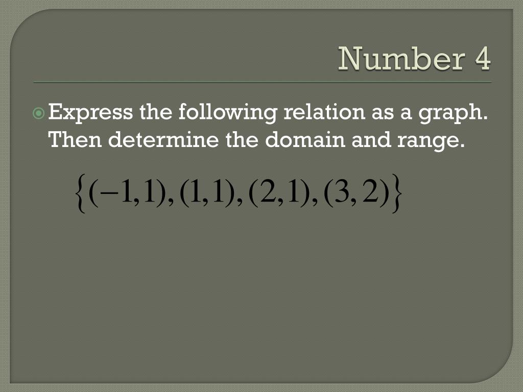 Number 4 • Express the following relation as a graph. Then determine the domain and range.