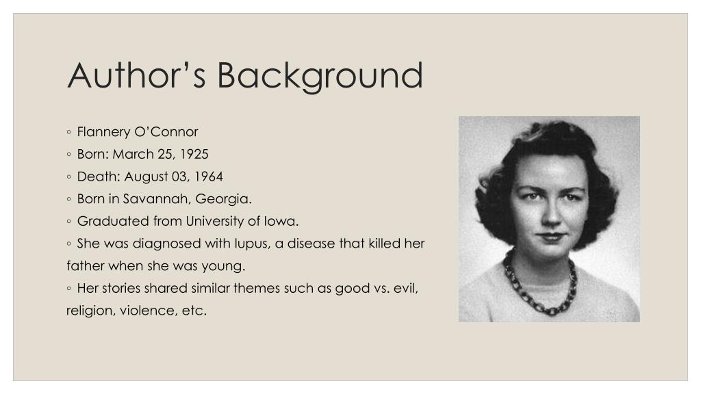 Author’s Background • Flannery O’Connor • Born: March 25, 1925 • Death: August 03, 1964 • Born in Savannah, Georgia. • Graduated from University of Iowa. • She was diagnosed with lupus, a disease that killed her father when she was young. • Her stories shared similar themes such as good vs. evil, religion, violence, etc.