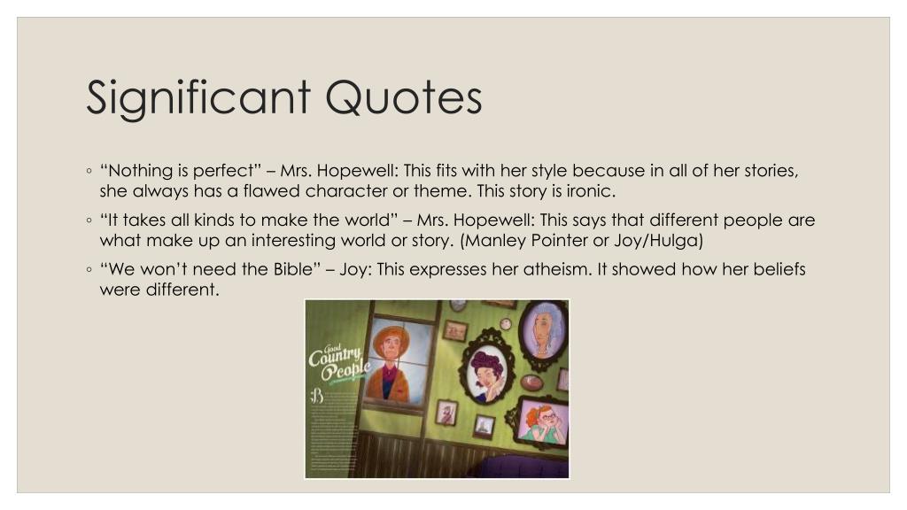 Significant Quotes • “Nothing is perfect” – Mrs. Hopewell: This fits with her style because in all of her stories, she always has a flawed character or theme. This story is ironic. • “It takes all kinds to make the world” – Mrs. Hopewell: This says that different people are what make up an interesting world or story. (Manley Pointer or Joy/Hulga) • “We won’t need the Bible” – Joy: This expresses her atheism. It showed how her beliefs were different.