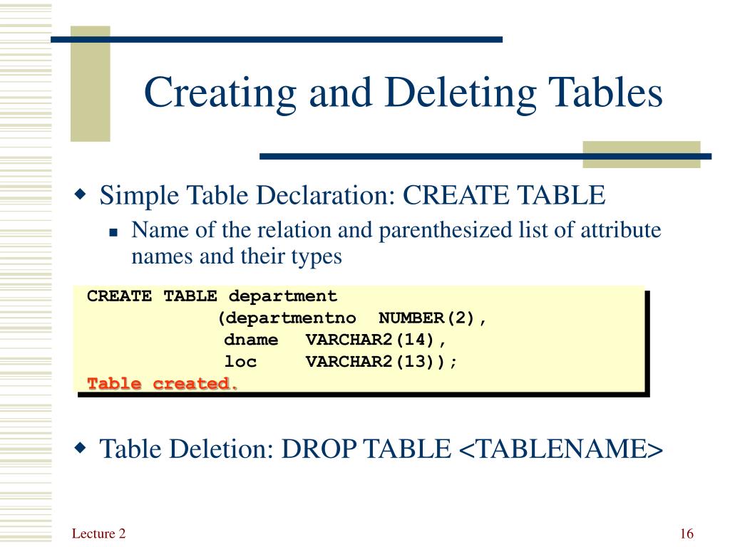 CREATE TABLE department (departmentno NUMBER(2), dname VARCHAR2(14), loc VARCHAR2(13)); Table created. Creating and Deleting Tables • Simple Table Declaration: CREATE TABLE • Name of the relation and parenthesized list of attribute names and their types • Table Deletion: DROP TABLE <TABLENAME>